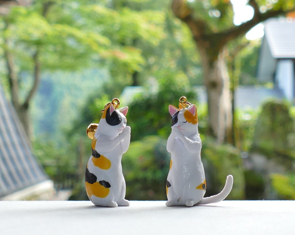 ◎井伊家のお参り手を合わす三毛猫どの幸せ守りガチャ