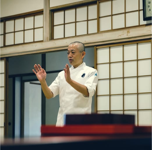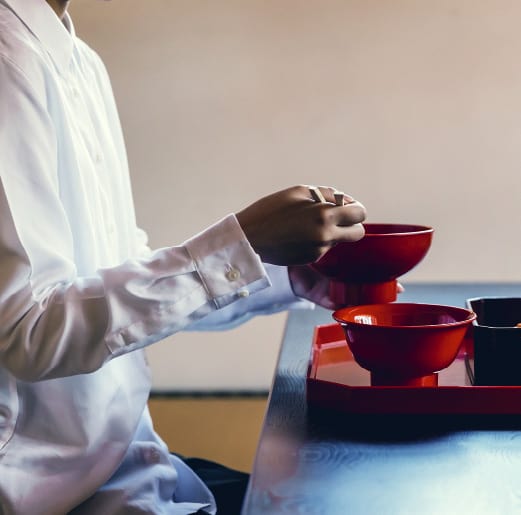政所平番茶を使った茶粥に、上品な煎茶粉をまぶしたものです。琵琶湖へと続く東近江一帯の水源である永源寺・政所。政所の茶木はその水源地である山々のミネラルを吸い上げて育ち、茶はその味に山の自然を映します。また、粥は広くアジアの米食文化圏で食されていますが、本日の粥は400年以上前から料亭で伝わる作り方を応用したものです。
